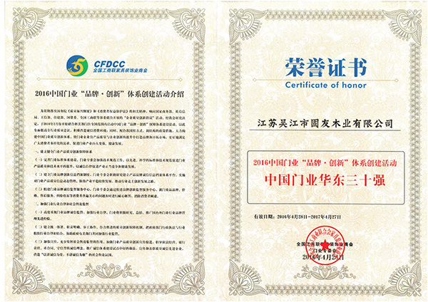 中國(guó)材與木制品流通協(xié)會(huì)木門(mén)窗專業(yè)委員會(huì)15周年榮譽(yù)證書(shū)